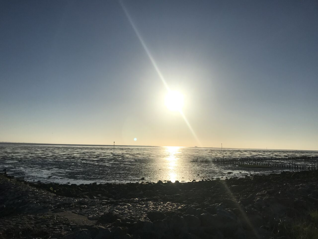 Am Wremer Deich haben Sie einen Blick aufs Meer und auf die Weser. Lecker Fischessen inklusive. Sonnenuntergang am Meer.